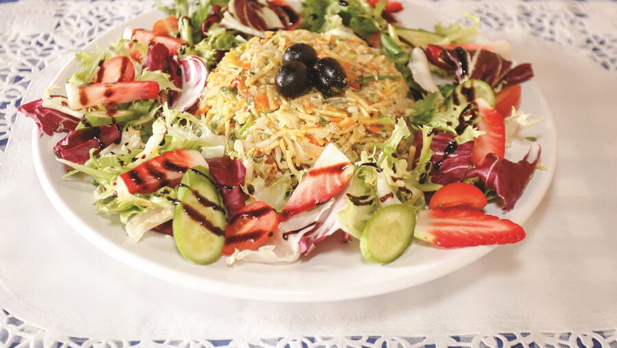 Os legumes, todos frescos, são picados finamente. Depois cozinham em lume brando num refogado de cebola e alho. As batatas (cortadas em palitos muito finos e a imitar a batata-palha) são fritas no momento. Os ovos entram inteiros na panela (um segredo da avó do chef) e os coentros e a pimenta preta moída dão aquele toque final. Cheira bem, cheira a legumes à Brás que vão para a mesa acompanhados com uma salada verde especial, com tomates-cherry, pepinos baby e morangos laminados. O tempero fica a cargo de um vinagre balsâmico.