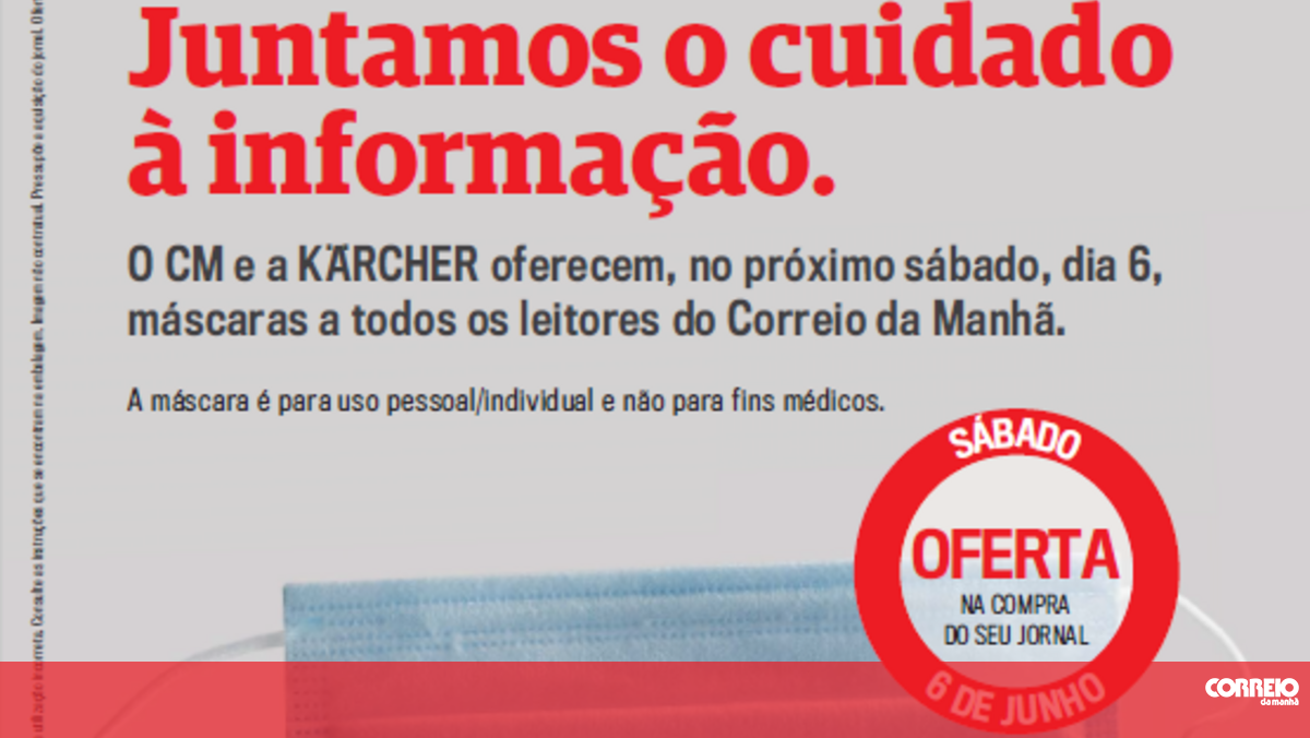 Uma iniciativa que se repete - é a segunda vez que o seu jornal diário lhe oferece uma máscara -, desta vez em parceria com a Karcher. A máscara, que oferecemos na compra do jornal, encontra-se devidamente acondicionada no interior de um plástico que envolve a revista Vidas, que acompanha a edição do CM nesse dia.