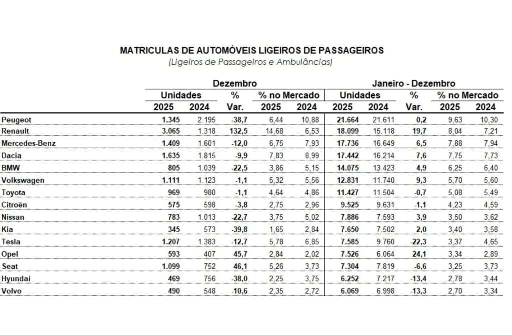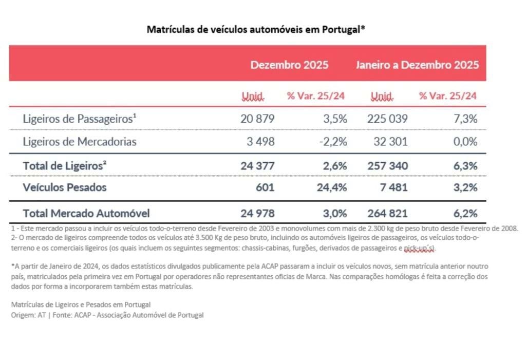 Já no que respeita a Dezembro último, houve um crescimento de 3,0% quando comparado com o mesmo mês de 2024, com 24.978 viaturas novas matriculadas.