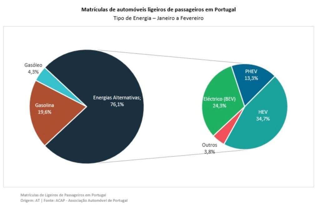 De Janeiro a Fevereiro, 76,1% dos ligeiros de turismo eram alimentados a energias alternativas, liderados pelos híbridos (+34,7%) e pelos eléctricos (+24,3%), com estes últimos a representarem 23,0% no passado mês.