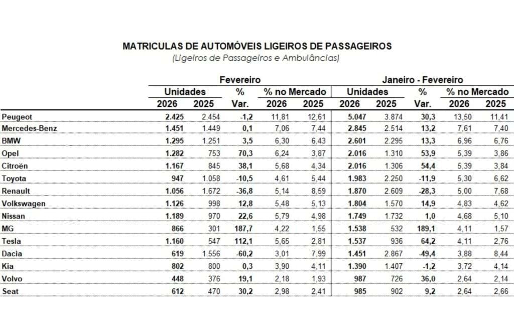 No campo dos automóveis ligeiros de passageiros novos, em Fevereiro foram matriculadas 20.541 unidades, ou seja, mais 5,5% do que no mesmo mês do ano passado.